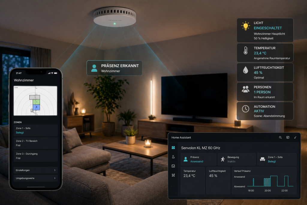 Der neue Senvolon KL MZ 60 GHz setzt genau an diesem Punkt an. Die Mehrzonen-Erkennung ist für mich das entscheidende Upgrade. Der Sensor erkennt nicht nur, ob jemand im Raum ist, sondern kann den Raum in Bereiche aufteilen. Genau dadurch wird aus einer einfachen Anwesenheitserkennung eine echte Raumlogik.